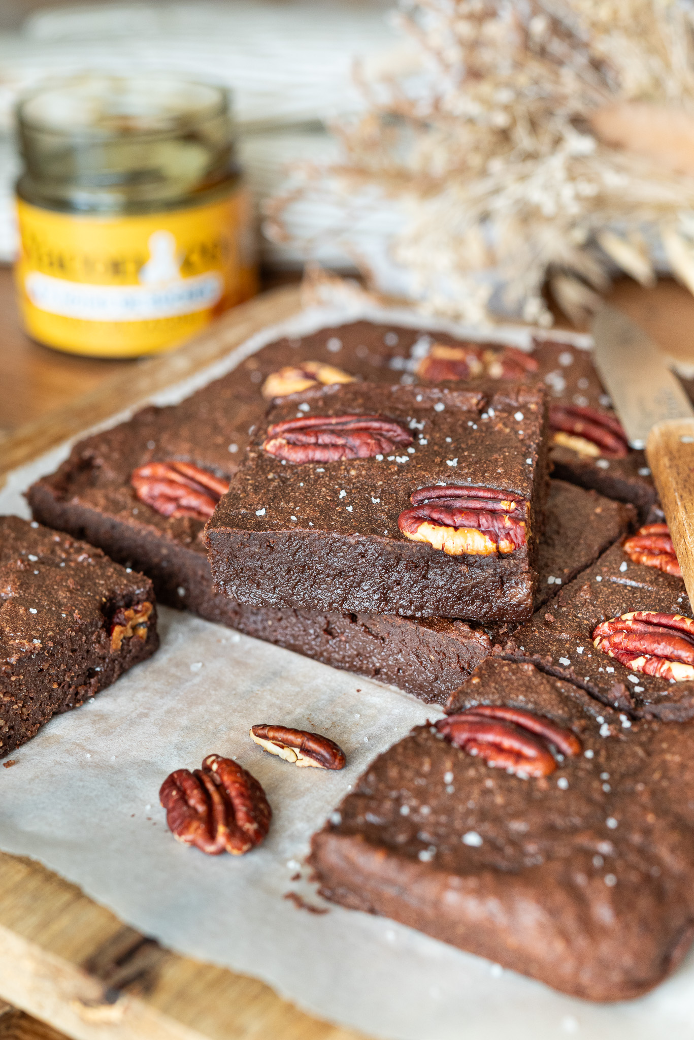 - Versez dans un moule carré 20x20cm tapissé de papier cuisson. Placez quelques noix de pécan grillées. Enfournez 15min à 180°C.