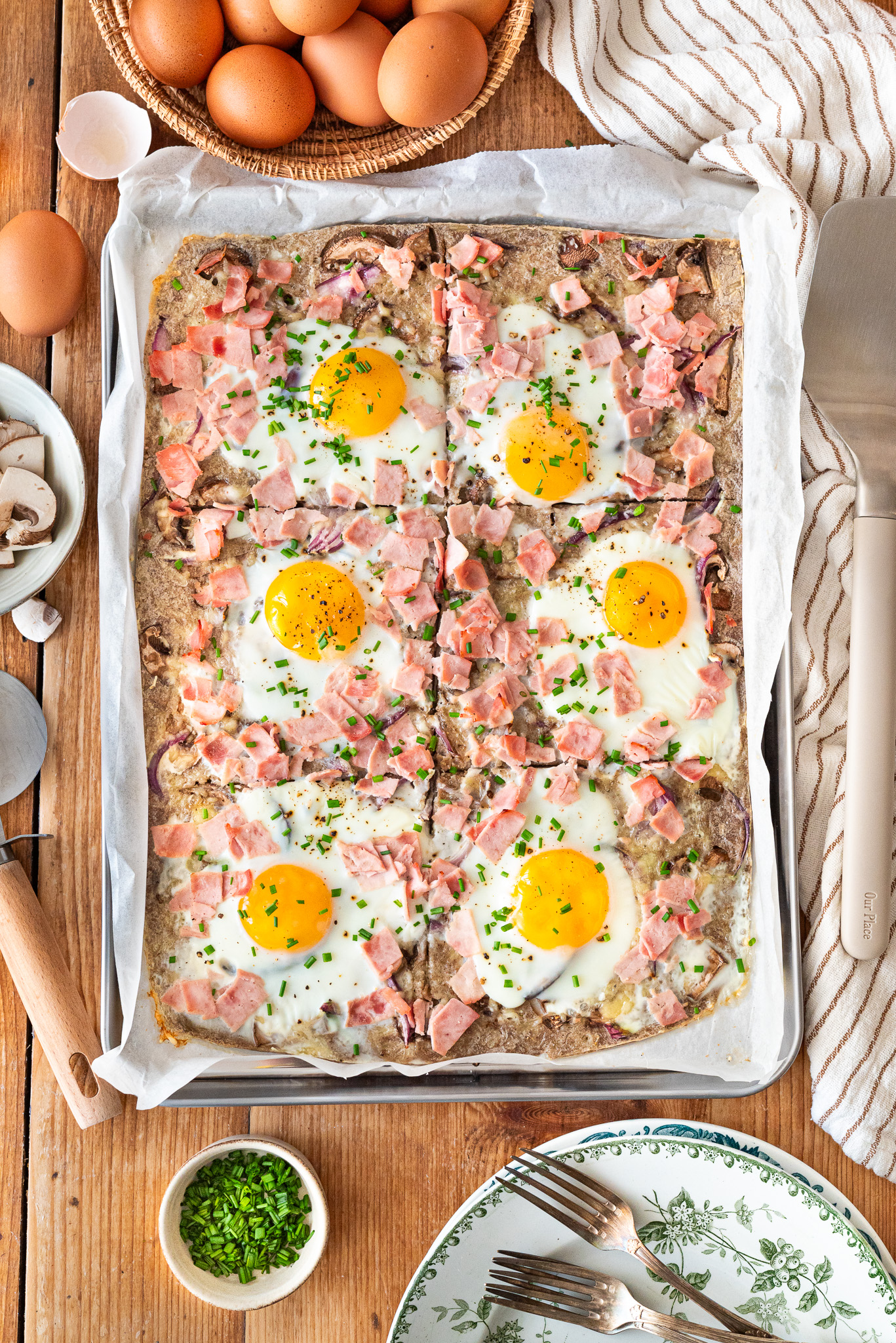 Sortez la plaque du four, cassez 6 oeufs dessus (selon la place que vous avez), salez, poivrez, parsemez de jambon et ré-enfournez pour 10min. Surveillez la cuisson, tous les fours sont différents : les blancs doivent être pris, le jaune rester coulant.