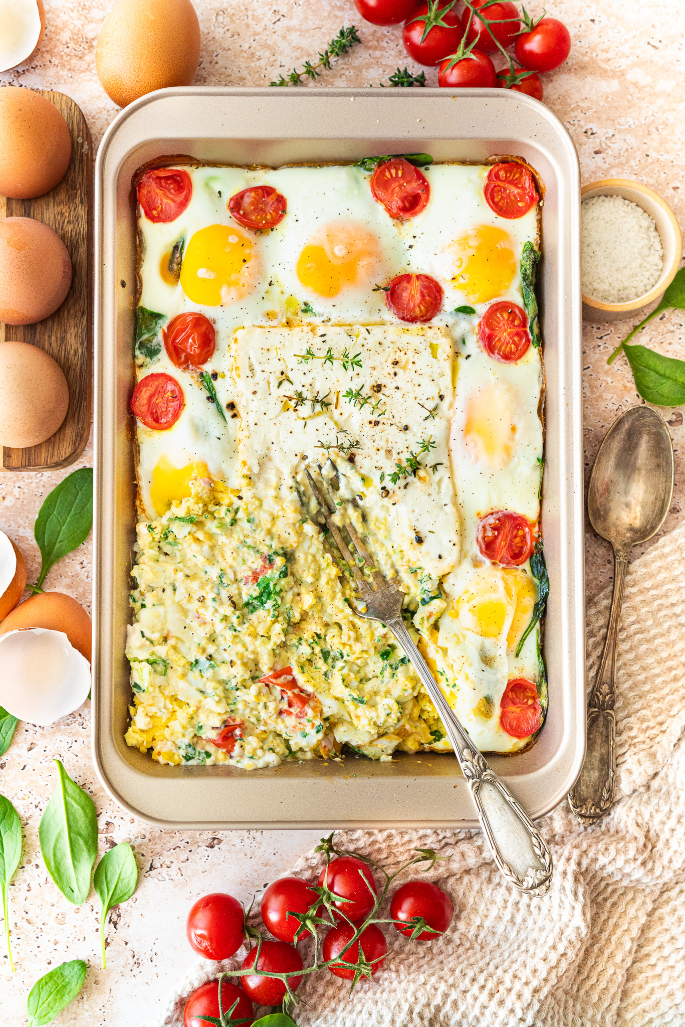 Cassez les oeufs autour de la fêta, puis parsemez de tomates cerises coupées en 2.
